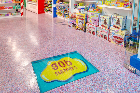 Gobstoppers is a UK based candy store offering American based sweets, chocolates, groceries and drinks. The company offer a unique shopping experience specifically designed to make its customers feel like a kid in a candy store. This new and exciting brand concept required a bespoke and exciting floor finish and therefore Gobstoppers contacted RESYN to help create their bold designs.